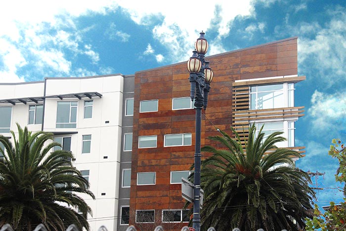 On the ‘prow’ end of a multifamily housing project in the Castro district of San Francisco, architect VWMP utilized EnFold Façade’s rainscreen system in aluminum finished with a paint that gives the panels the appearance of rusted steel.