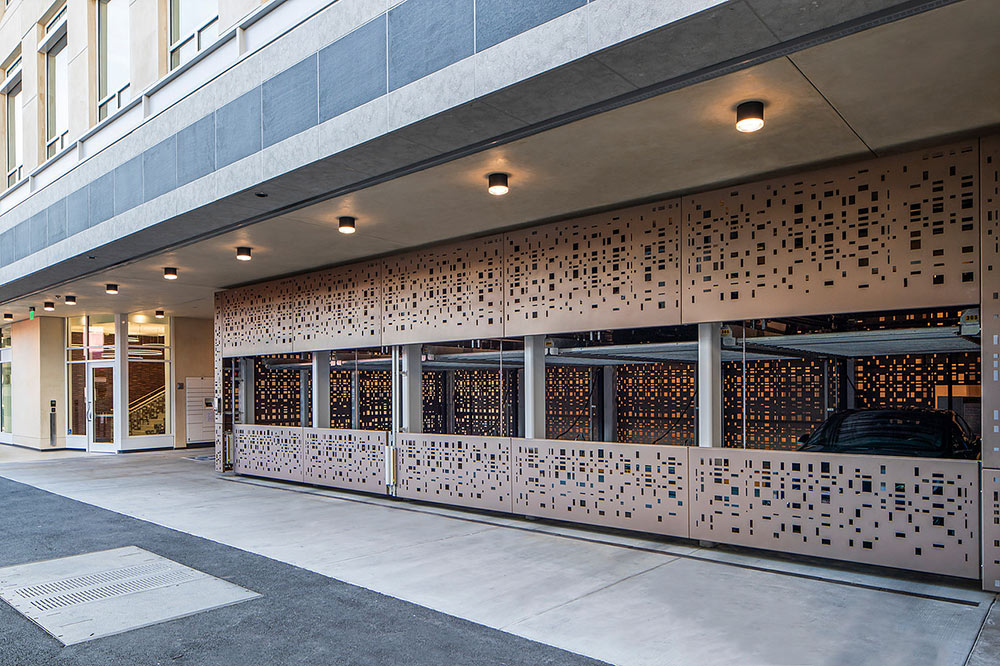 EnFold Façade wallscreen panels elevate the aesthetics of this highly mechanized, auto stacking system in San Francisco. The system utilizes both fixed and movable panels and provides a pleasing alternative to chain link barriers and better concealment of automobiles. The opportunity for enhanced architectural detail with both pattern and color is repeated on a mechanical enclosure in a common area located on the roof patio.