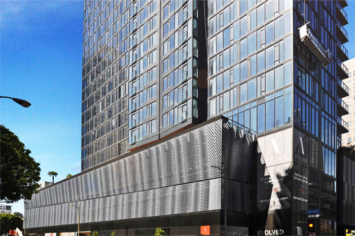 This high-rise residential tower sits atop four levels of above ground parking in Downtown Los Angeles.
