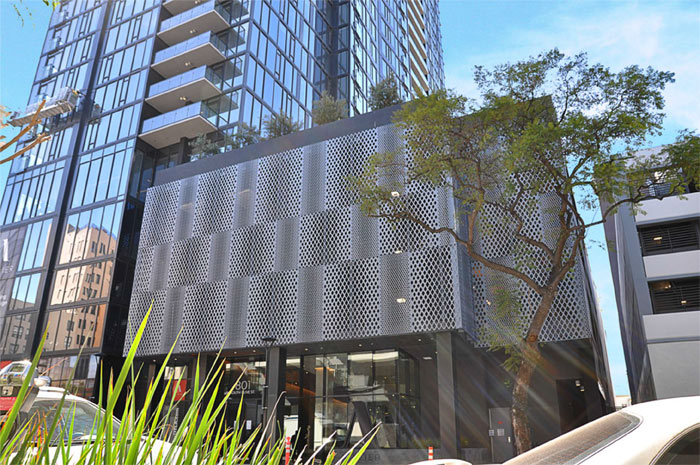 EnFold Façade provided the wallscreens for the parking garage in a custom pattern created by SCB Architects of San Francisco.