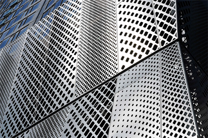 The wallscreen panels are tilted out at both the top and bottom from a diagonal slot across the face of the building. This was achieved by securing our panels to shaped, vertical fins that are attached directly to the edge of slabs for an efficient and dramatic installation.