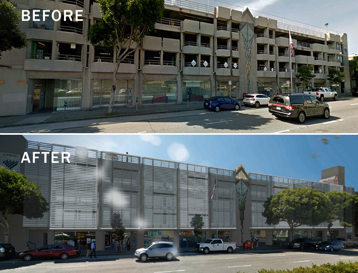 The aging Lombard Street Garage, owned by the City of San Francisco, had a failing EIFS stucco system skin. Rather than replace the stucco, EnFold Façade helped develop a system of stripping away the existing skin and replacing it with metal panels over most of the façade.
