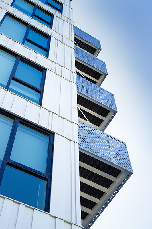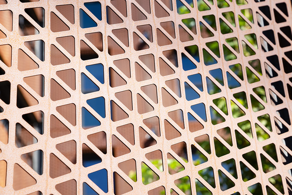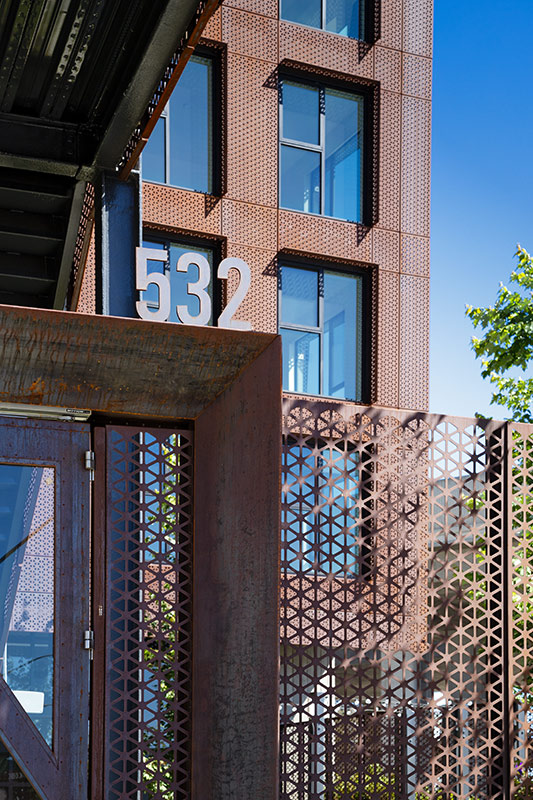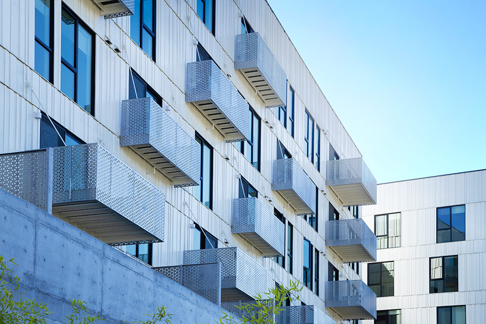 Our scope for this project spans all four perimeters and consists of rainscreens with integrated sunshades, riveted panels, perimeter fencing with blade brackets, aluminum balconies, Cor-Ten guardrails and stair guardrails, and gate shrouds. One particular challenge of this project required the rainscreens to be cantilevered off of the building due to its design. We managed to easily modify our panels to suit these unique conditions.