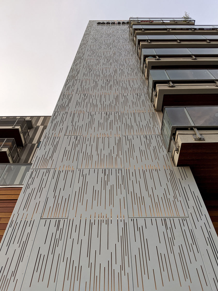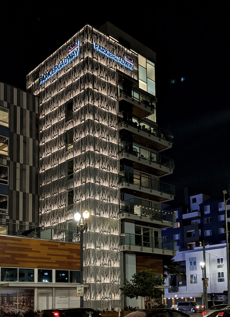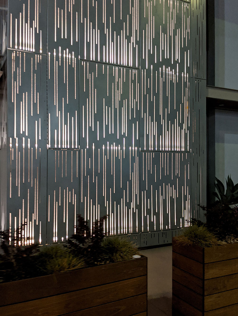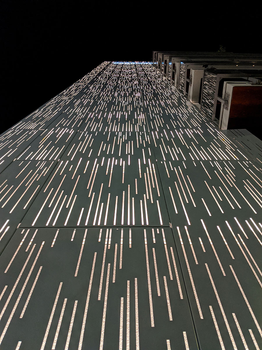 Our lightweight panels showcase elegant laser-cut strokes that blend into side flanges. At night, the LED backlighting creates vibrance and energy in this beachside district which is an epicenter for numerous shops, restaurants, and entertainment.