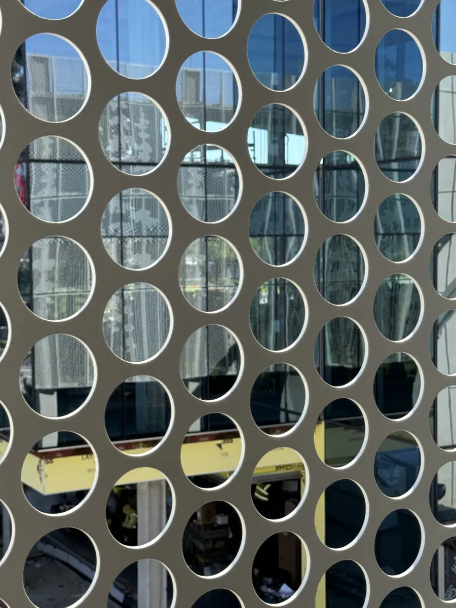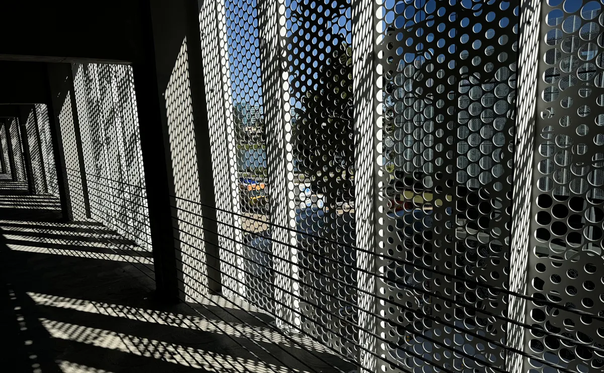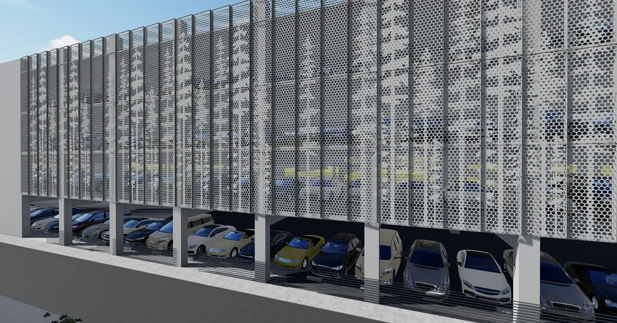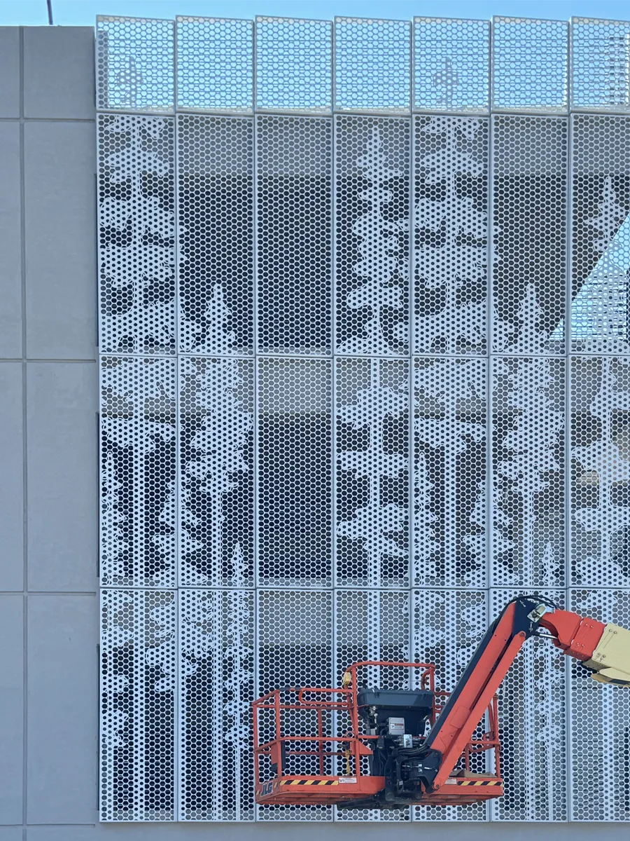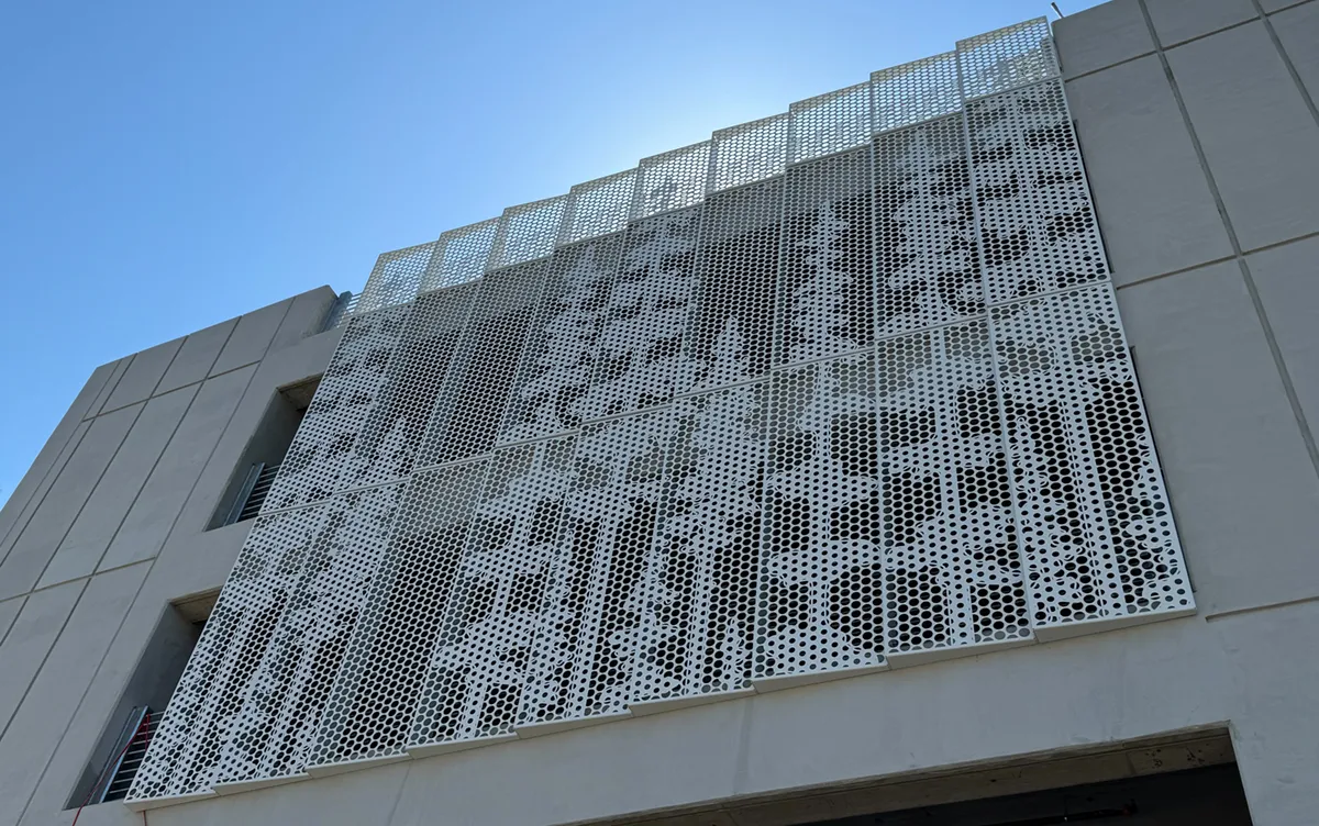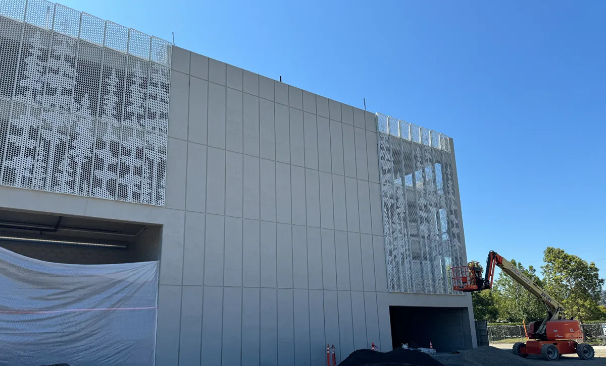 Enfold Façade debuts the new Bracketless Garage Screen on Twin Dolphin’s parking structure. This four-story parking complex features Enfold Façade panels that span from floor to floor. These panels utilize a tab-and-slot slip system that allows for differential movement between the slabs. The pattern displayed on the Bracketless Garage Screen system consists of a collection of circles that depict redwood trees. The pattern is 50% open to allow for natural ventilation in the garage.