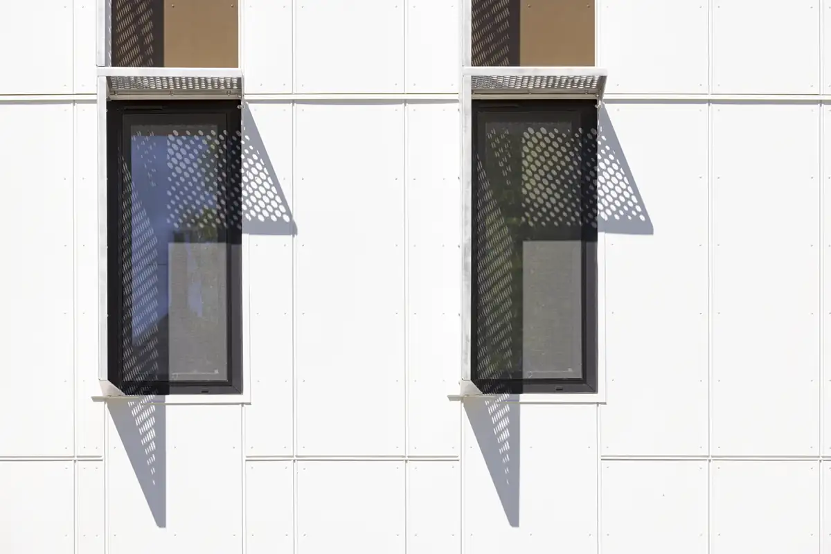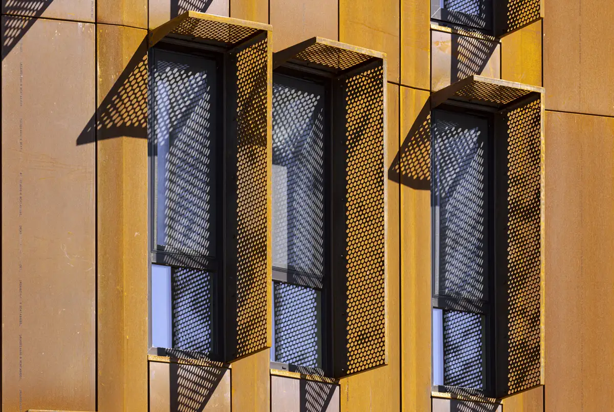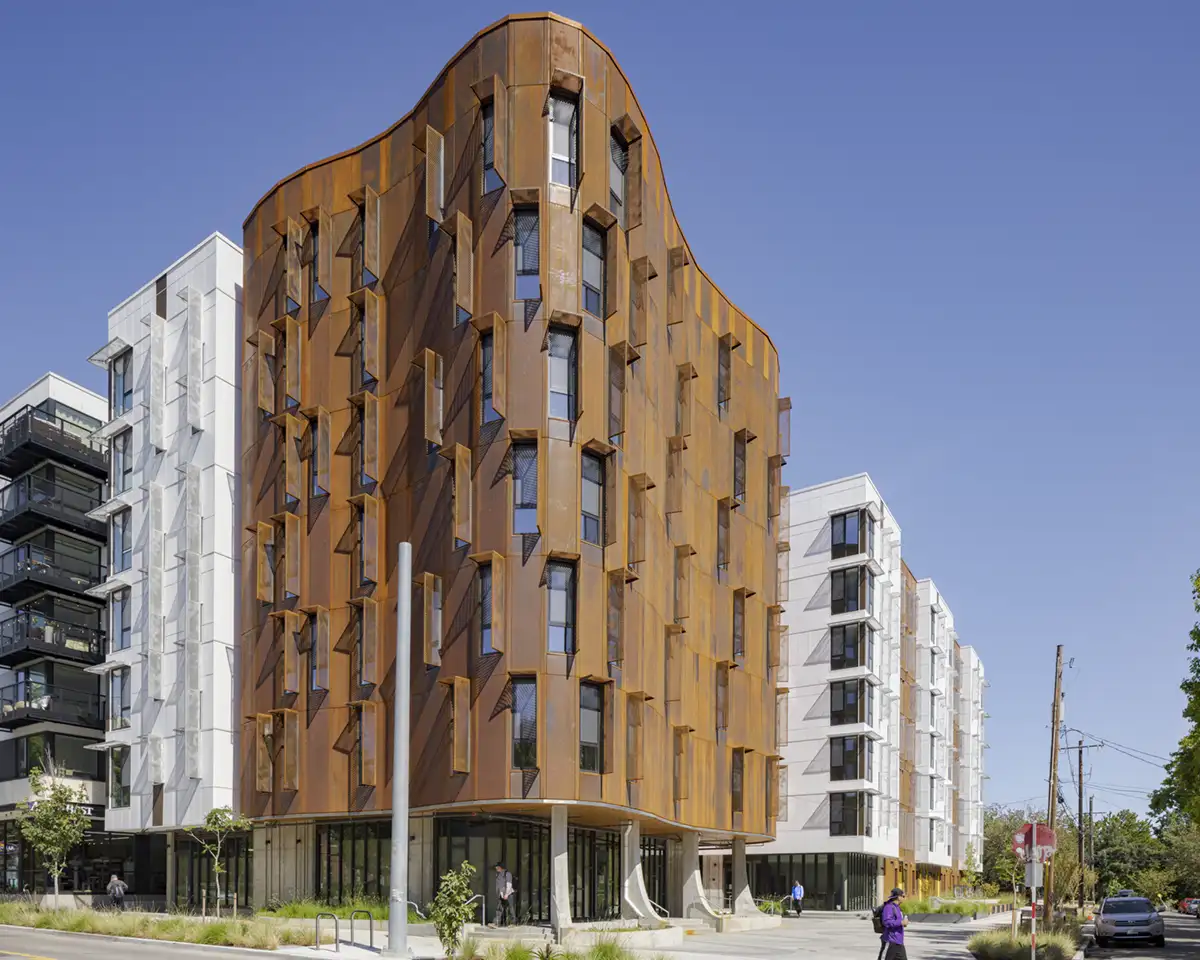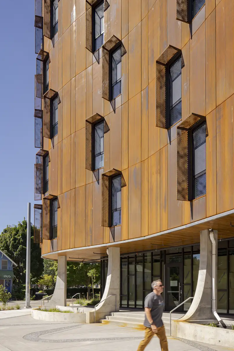 Enfold Façade is partnering with DBA and GGLO to design a curved rainscreen façade inspired by African architecture. The organic form challenges Enfold Façade to carefully compose a seamless array of rain-screen panels that reflect the building’s unique silhouette. Africatown, a seven-story mixed-use development, will feature 126 affordable homes and offices with a distinctive shape that stands out. Enfold Façade features a product from BŌK Modern which is the Nail-On Sunshade, known for its ease of installation and sleek design that enhances the building’s aesthetic. Available in both Cor-Ten and aluminum, the sunshades feature an abstract circular pattern, combining functionality with artistic appeal. Enfold Façade’s expertise in custom Rainscreens and BŌK Modern’s Nail-On Sunshades will highlight the building’s graceful movement, bringing its design to life.