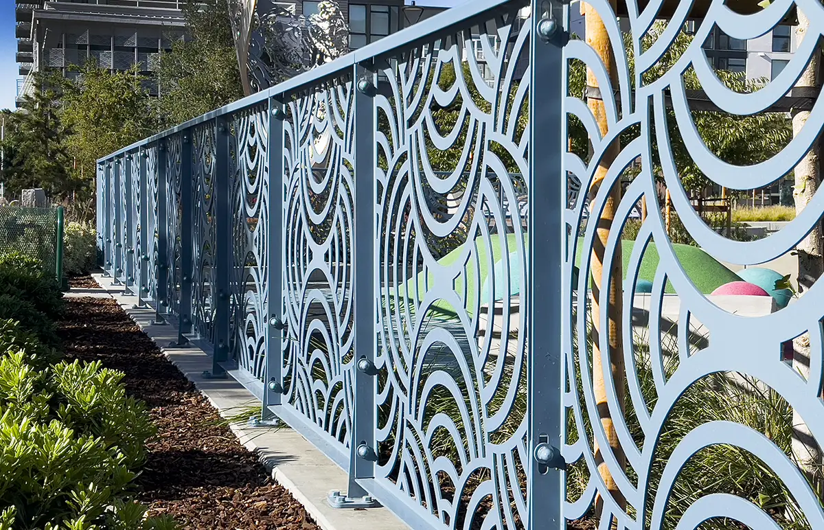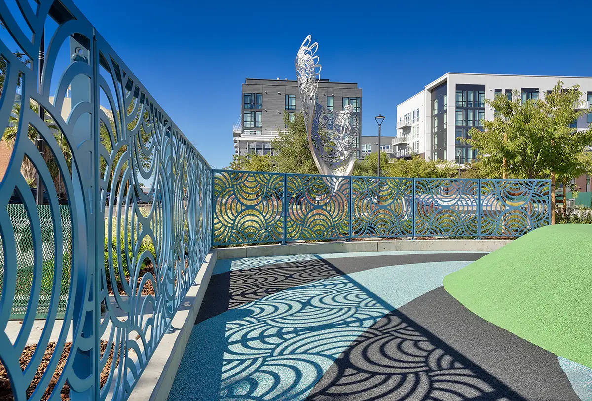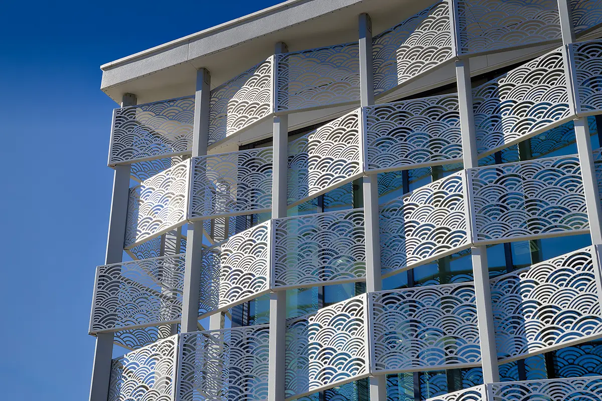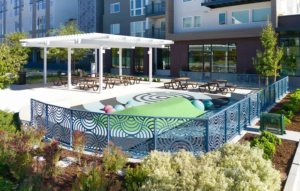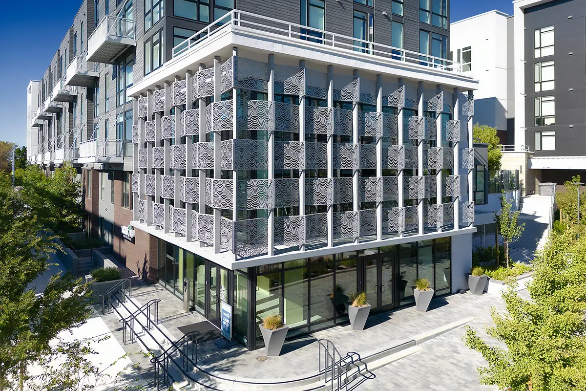 The mixed-use community sits on more than four acres and includes a public park, the new home for the San Jose Taiko, and the Center for Creative Arts. The new structure’s exterior features Enfold Façade, a division on BŌK Modern’s custom pattern wallscreens in a soothing palette Argento White and Military Blue, providing a sense of calm, serenity, and artistry to the common areas.