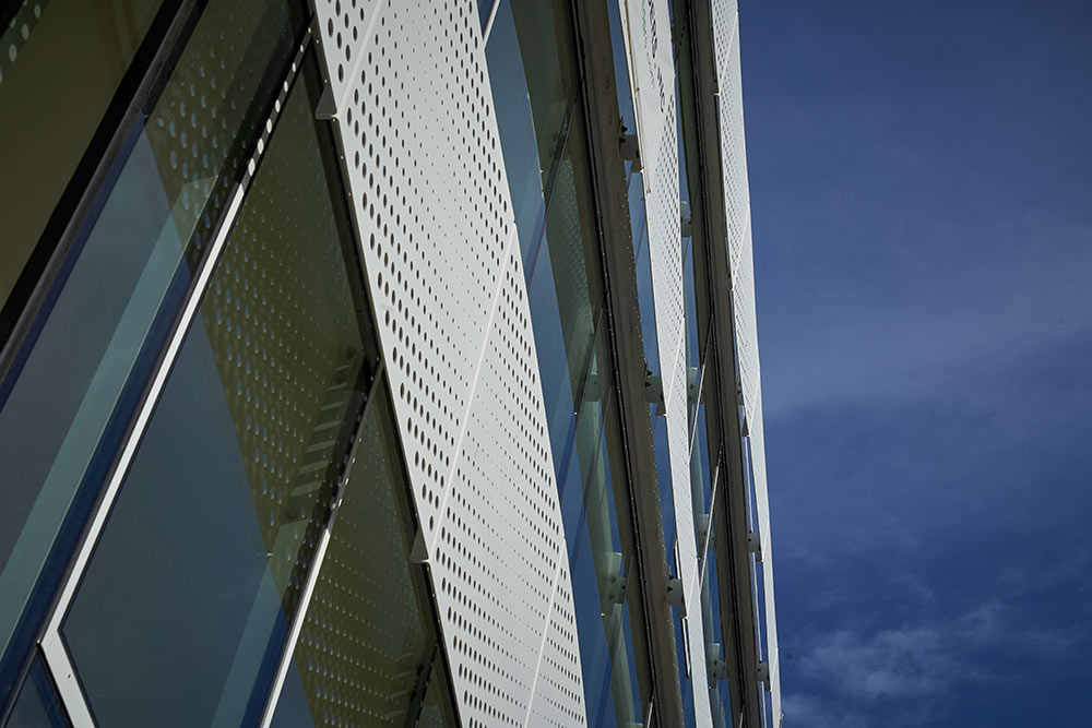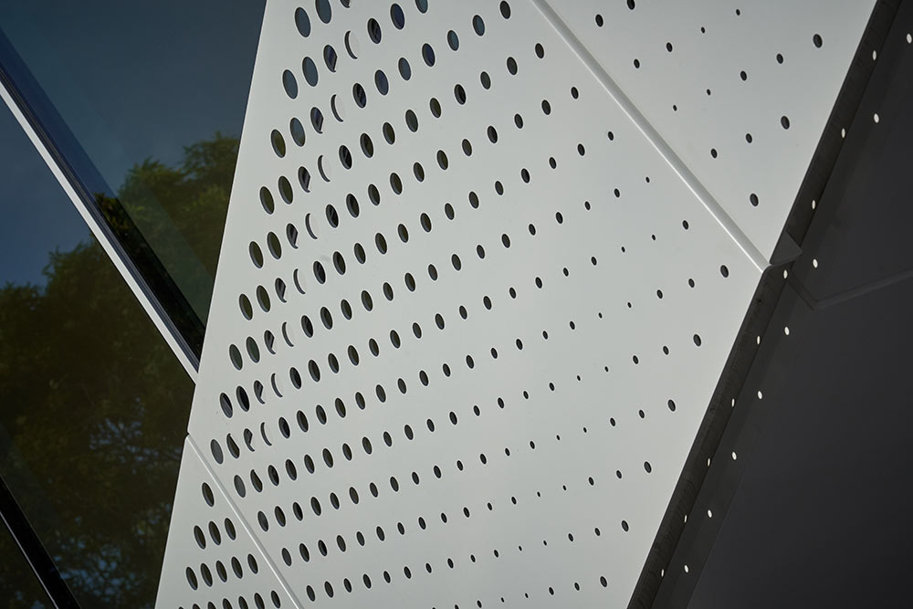 BŌK Modern’s wallscreen system at 2301 Lombard is a custom pattern, quarter inch solid aluminum plate with a powder-coat finish. The panels are supported by our unique slab-edge embeds with folded side flanges that are easily attachable to knife blade brackets for simple installation and a dynamic look.